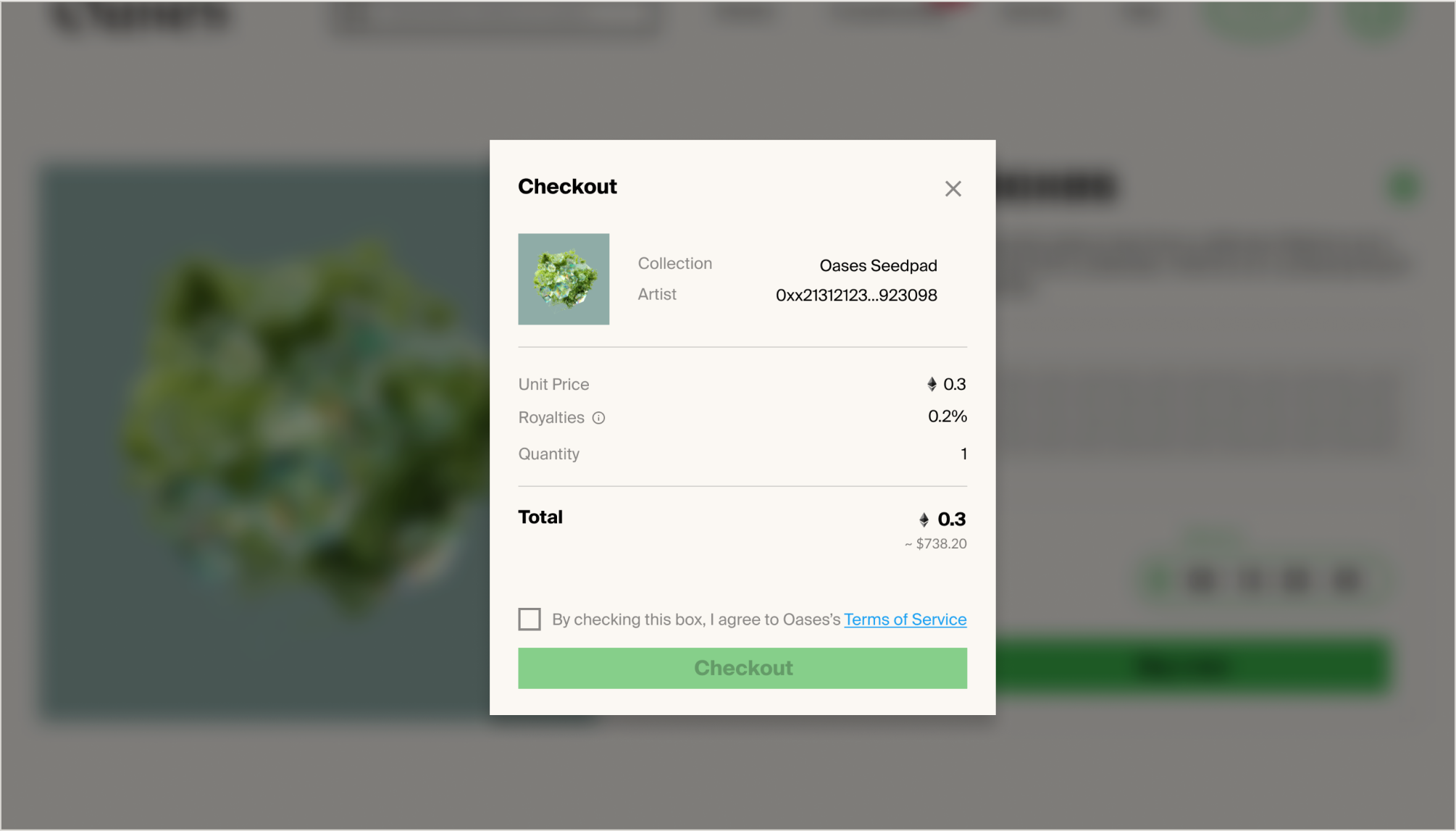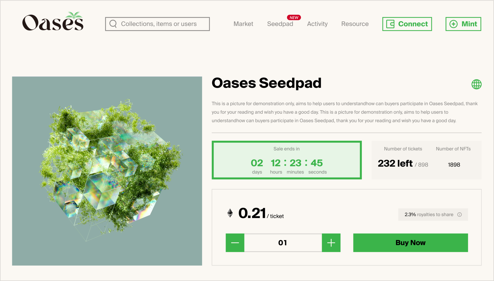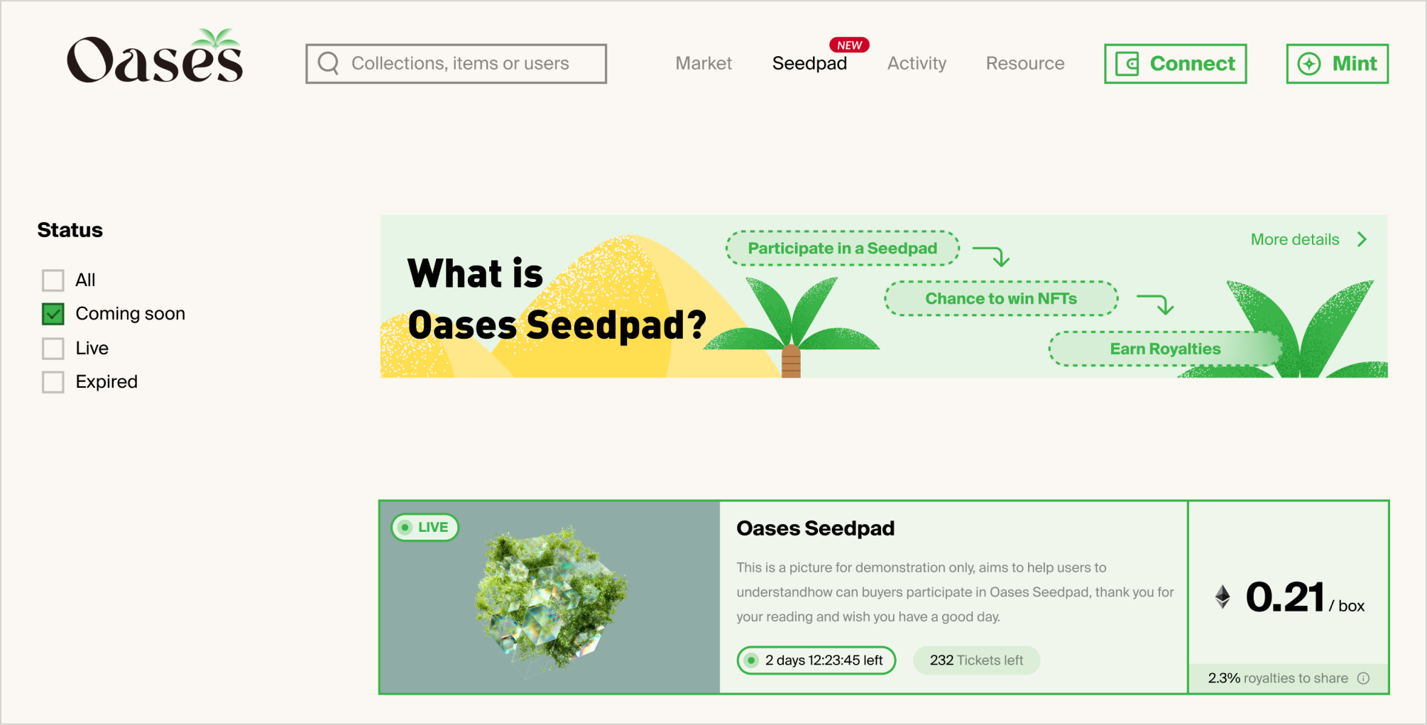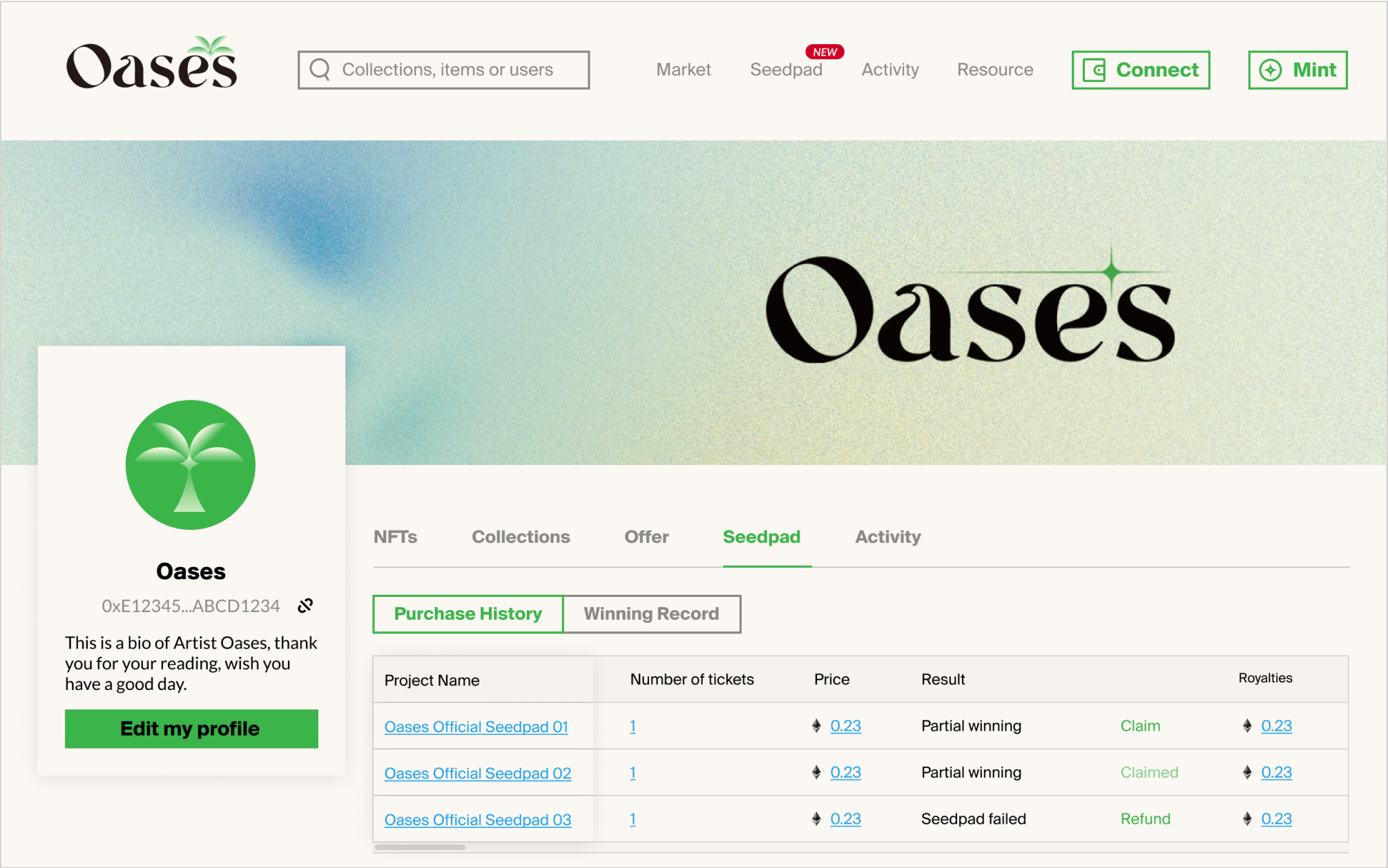 For each purchased ticket, you will automatically be allocated the pre-defined share of future transaction royalties of the corresponding NFT collection. You can enter Profile-Seedpad at any time to view and claim your royalties. Unclaimed royalties will be stacked over time until claimed. Note that Oases only supports the sharing of royalties generated by on-chain ETH transactions. Stacking royalties will therefor be more gas and cost effective.